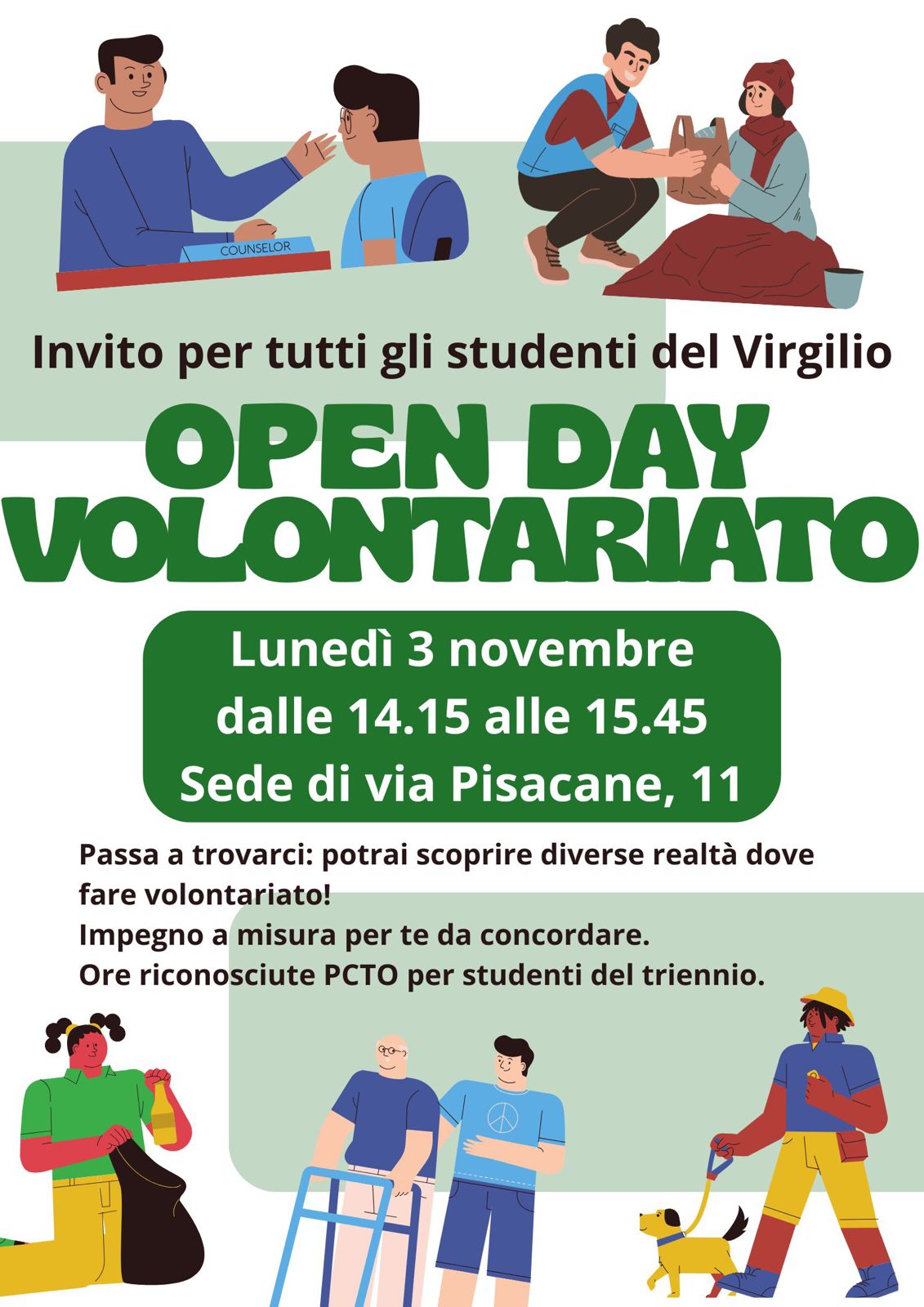 Lunedì 3 novembre 2025, dalle ore 14.15 alle 15.45 circa, nella sede di Via Pisacane 11, si svolgerà la decima edizione dell’Open Day del Volontariato, durante la quale enti ed associazioni presenteranno alle studentesse e agli studenti del Liceo Virgilio gli ambiti e le attività in cui potersi impegnare con azioni di volontariato.